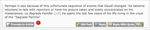 1: Users with permissions to publish a forum post into an article will see the "Promote to Article" button on each forum post. This user can push the button which will then bring up the "Add/Edit" article screen in the Content Management System.