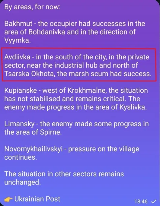 Regarding the way the battle is unfolding, Maliar states that “the Russians use the tactic of small assault groups. This is essentially the Wagner tactic. In this way, they save personnel, but to destroy such a group the same amount of ammunition is required as for large groups.” This statement denies two of the main arguments that Ukraine and its allies have used against Russia throughout this war: the idea of ​​hordes of unarmed men and the inability to learn. During the first year and a half of the Russo-Ukrainian war, kyiv has repeatedly alleged Moscow's lack of interest in preserving the lives of its soldiers, sending huge groups of people against the best-armed Ukrainian troops. The Zelensky Government has also used Russia's repetition of mistakes - whether real or not - as a mockery, creating an image of a constant cycle of large groups of men always crashing into the same obstacle.